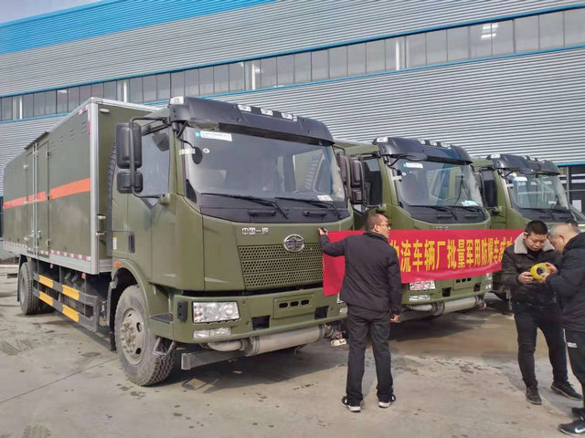 此次吉林楊總采購我公司解放牌火工品運輸車,為軍區所運輸爆破物品,黑火藥,導火索等,認可了我公司生產的廂體品質,以及對于細節焊接的工藝,對于和軍區合作該車輛,我公司全心全力投入到生產計劃當中,而對于能夠和軍用所需車輛合作,是對我公司生產車輛的一種驕傲與自豪。