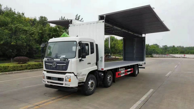 如圖大家看到,該車就是我公司生產的飛翼形式車型,該車可以從貨箱的兩側來進行展開,朋友們也可以很輕松的從兩側都可以進行裝卸的工作要求,一般這種形式適合大型車輛的裝放,比如我們如圖所示的這種就是三軸的車型,適合長途運輸以及15噸左右的貨物來進行裝卸工作。