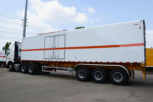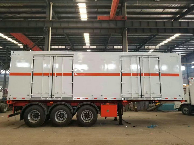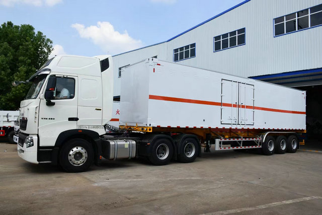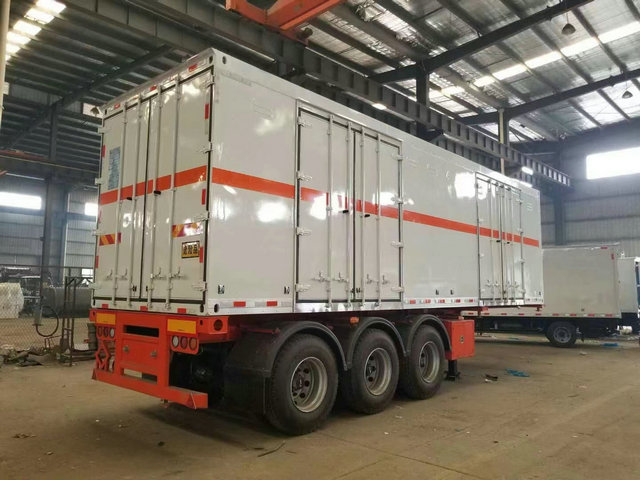如圖所示的這種就是危險品半掛貨箱,該車是在底盤骨架的基礎上面還對于貨物有一個很好的運輸效果的,該車的貨箱可以達到13米左右的尺寸,這種車一般需要在前面利用于牽引拖頭等的牽引左右,來進行運輸。