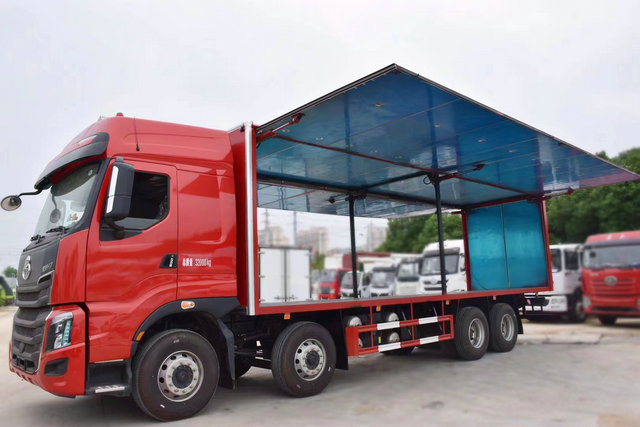 如圖我們所展示的此款車型就是飛翼形式的危險品貨車,如大家所看到該車的兩側廂體都可以飛翼展開,這樣的話無論我們從哪邊進行裝卸都是非常方便的,而且此款車也是符合政策的要求標準等,讓大家無論是在上戶,還是監測都是沒有問題的。