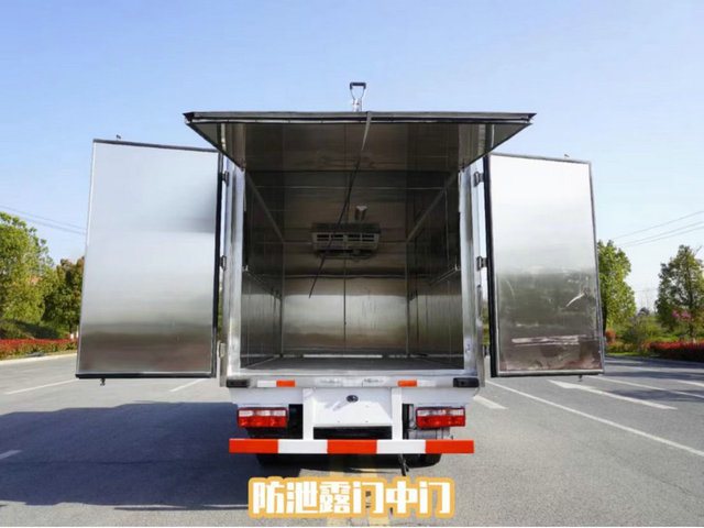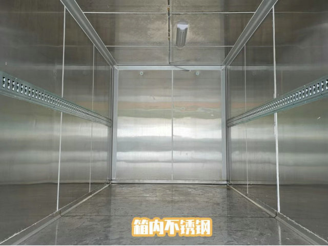 那么廂體作為主要承載的容器,其得益安全保障的前提是什么呢,如圖我們看到的此款圖片就是貨箱內的配置,不僅擁有不銹鋼的材質作為主要抑制細菌微生物的滋生,更是有紫外線消毒以及固定貨物的裝置等,前部更是通過制冷溫度機達到對于廂內溫度的控制等,各個方面都是保障醫療廢物安全運輸的配置標準。