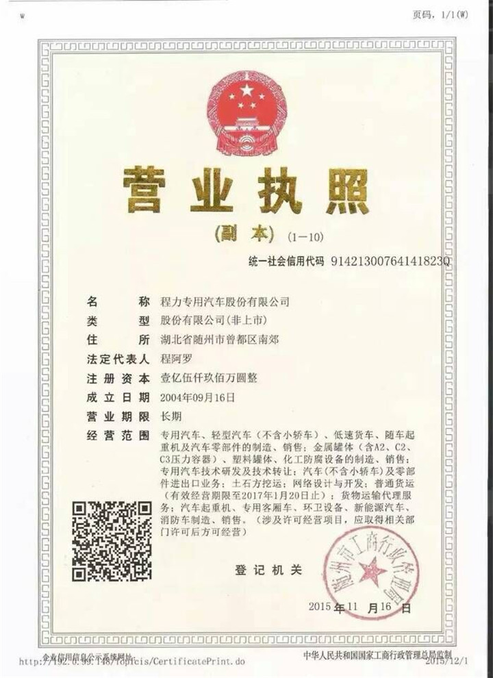 湖北程力專用汽車有限公司在同行業(yè)相比是生產(chǎn)資質(zhì)最全,產(chǎn)品品種最多的專汽公司,在全國專汽領(lǐng)域擁有五個全國第一:公司環(huán)衛(wèi)車銷量排全國第一,輕型專用車產(chǎn)銷量全國第一,全國第一家一次性通過A2、C2三類壓力容器的民營企業(yè)、第一家一次性通過低速貨車整車資質(zhì)驗收的企業(yè)、第一家通過消防車國家新標準驗收的民營企業(yè)。公司也是全省唯一取得隨車起重機生產(chǎn)制造資質(zhì)的企業(yè)。程力集團公司總的發(fā)展方向是以汽車及專用車為主,打造世界一流汽車改裝制造基地。