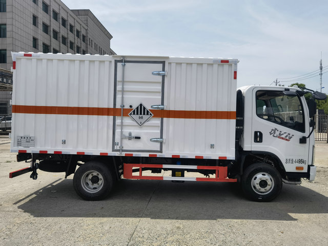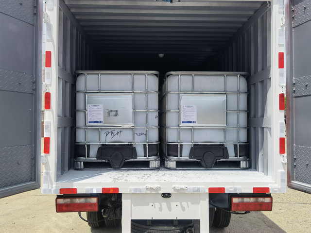 如圖類似這款就是用來運輸桶裝液體的車輛,該車貨箱的內部裝放的是盛滿溶液的噸桶,利用這種噸桶來進行運輸的話,可以很好的將貨物保持至一個完整性,而且對其的密封嚴格度也是比較合適的。