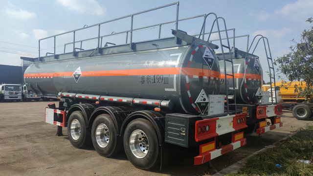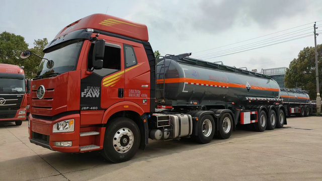 如圖大家看到的這款是罐式車輛,也是罐式車輛當中比較大的車型,采用的是半掛牽引的這樣一個罐體,該車可通過泵的抽吸力度等直接將溶液抽吸到罐體內部進行運輸配送,不需要經過打包好以后再進行運輸,無疑對于我們的運輸裝卸程度有很好的優勢存在。該車的罐體可以達到29立方,滿足我們對于強酸,硫酸,鹽酸等腐蝕性物品的運輸。
