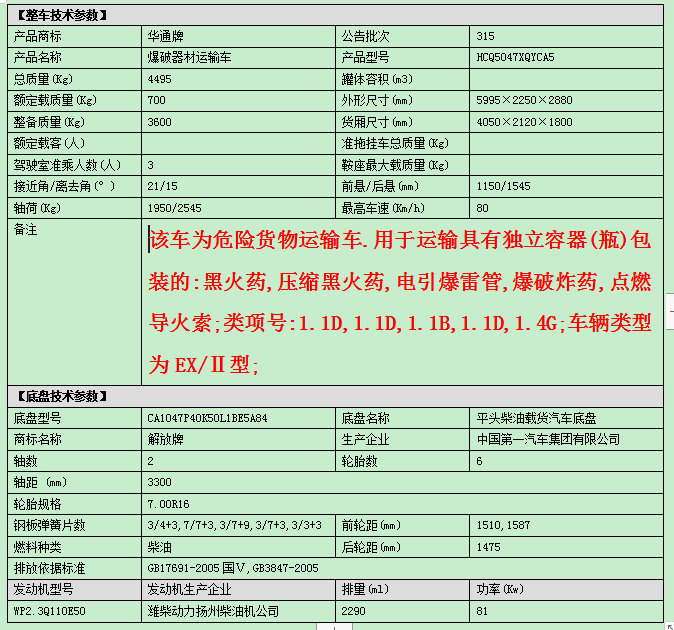 推薦文章火工品運輸車,又名為:爆破器材運輸車,是一種用于運輸雷管,炸藥,黑火藥等的專用運輸車,該類危險品因存在極大的安全風險,所以必須采用專用的危爆器材運輸車才能予以運輸,那么運輸這類危險品的對車型有什么要求呢?