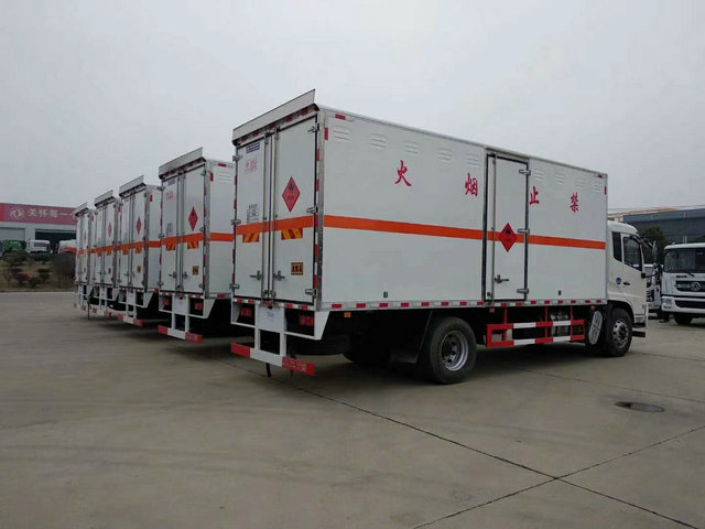 東風天錦載危爆車:廂體長寬高:6200X2450X2400(MM),核載噸位:9.99噸,車輛外部采用專用冷軋鋼板,內部采用鋁板,夾層復合阻燃材料,嚴格控制防火阻燃性,車廂內以及邊部安裝的有煙霧報警器以及固定裝置,廂體貼‘爆破器材’危險品標識。