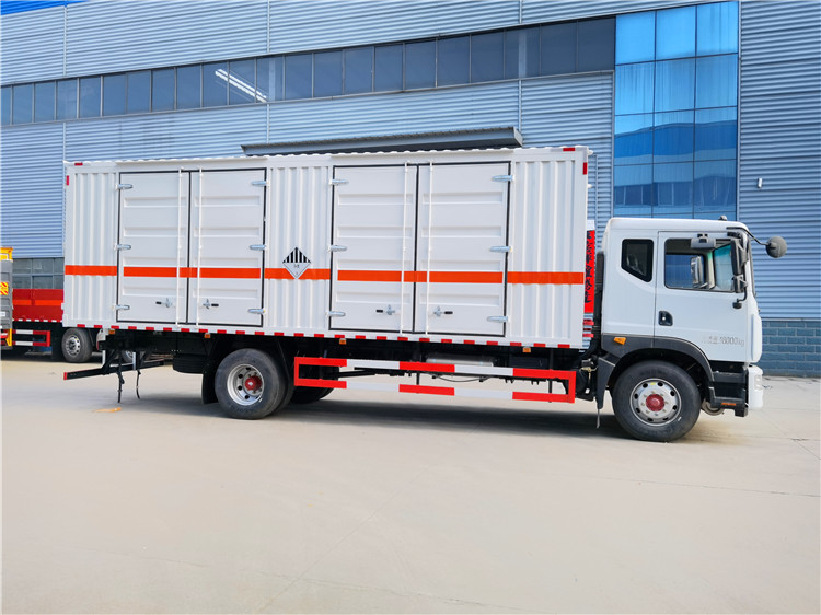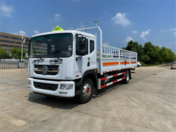 這款車型為東風的易燃氣體車型,貨箱形式的,尺寸也是7600X2400X2500(MM),這樣的車型尺寸,噸位也是10噸左右,不過貨箱形式結構的車型可以運輸包括易燃氣體,易燃液體和危廢雜項等等,那么欄板車是只能運輸二類氣瓶的運輸的,因為露天形式的結構車型沒有一個很好的密封保障。廂式貨車的結構在密封安全性能上面還是安全很多。