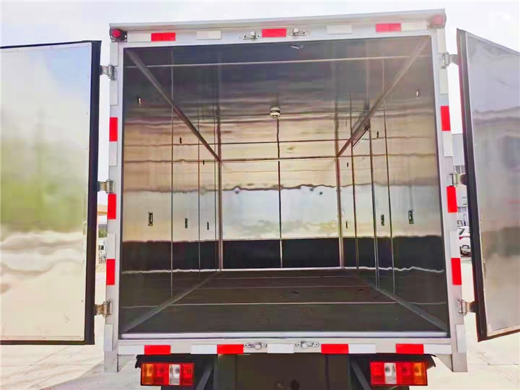 貨箱的內部我們可以看到,目前采用的這種都是符合類似桶裝油運輸的標準廂體,該車廂非常適合噸桶一般的危險品來進行配送,前后可以載重大概4-5噸這樣的危險貨物。