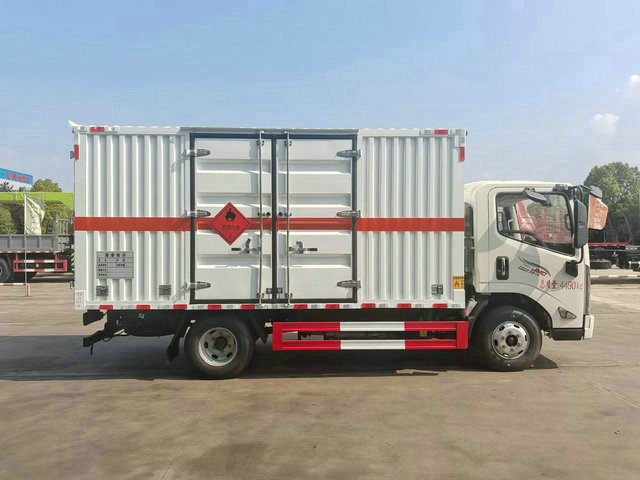 江鈴凱運爆破器材運輸車底盤配置:廂體長寬高:9600X2400X2000(MM),核載噸位:9990(KG),用冷軋鋼板,內(nèi)部采用鋁板,夾層復(fù)合阻燃材料,嚴(yán)格控制防火阻燃性,車廂內(nèi)以及邊部安裝的有煙霧報警器以及固定裝置,廂體貼‘爆破器材’危險品標(biāo)識。