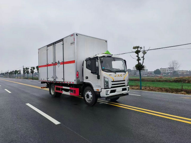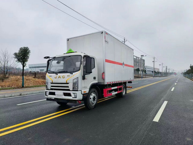 江淮S9爆破器材運輸車底盤配置:廂體長寬高:5600X2400X2000(MM),核載噸位:6500(KG),用冷軋鋼板,內部采用鋁板,夾層復合阻燃材料,嚴格控制防火阻燃性,車廂內以及邊部安裝的有煙霧報警器以及固定裝置,廂體貼‘爆破器材’危險品標識。