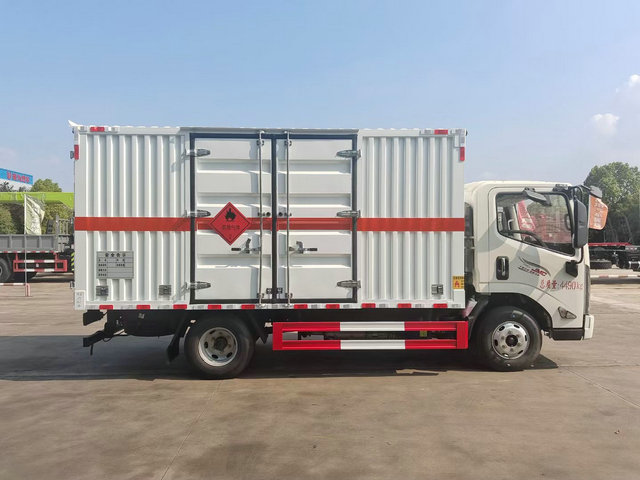 江鈴凱運易燃固體廂式運輸車上裝配置:廂體長寬高:4200X2100X2000(MM),荷載噸位:1100(KG),車輛外部采用專用冷軋鋼板,內(nèi)部采用鋁板,夾層復(fù)合阻燃材料,嚴(yán)格控制防火阻燃性,車廂內(nèi)以及邊部安裝的有煙霧報警器以及固定裝置,廂體貼‘易燃固體’危險品標(biāo)識。