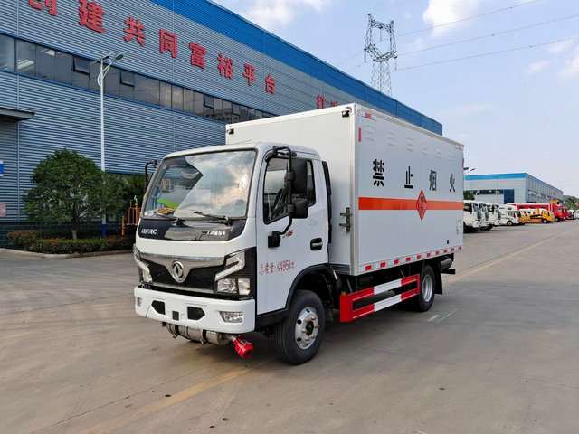 東風氧化性危險品運輸車上裝配置:廂體長寬高:4100X2000X1850(MM),核載噸位:1噸,車輛外部采用冷扎鋼板,內鋁板,夾層復合4公分厚阻燃材料,內部配備煙霧報警器,以及側門配備防盜報警器,以及通風口和固定貨物的卡槽裝置。