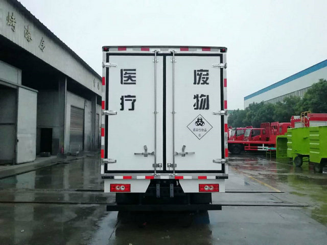 福田領航醫療廢物運輸車上裝配置:廂體長寬高:4080X2050X2100(MM),核載噸位:1噸,車輛外部采用國標玻璃鋼,內部采用304不銹鋼,夾層復合4公分厚保溫層,廂體頂部配有紫外線消毒燈,以及噴淋水裝置,安裝零下5度殺菌制冷機,通過降低溫度,紫外線消毒,淋水干凈等方式達到安全運輸的效果。