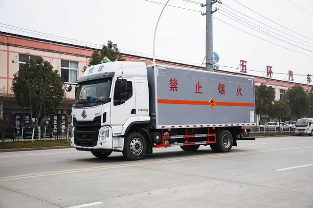 柳汽腐蝕性物品廂式運輸車上裝配置:廂體長寬高:6200X2300X2400(MM),荷載噸位:10500(KG),車輛外部采用專用冷軋鋼板,內部采用鋁板,夾層復合阻燃材料,嚴格控制防火阻燃性,車廂內以及邊部安裝的有煙霧報警器以及固定裝置,廂體貼‘腐蝕品’危險品標識。