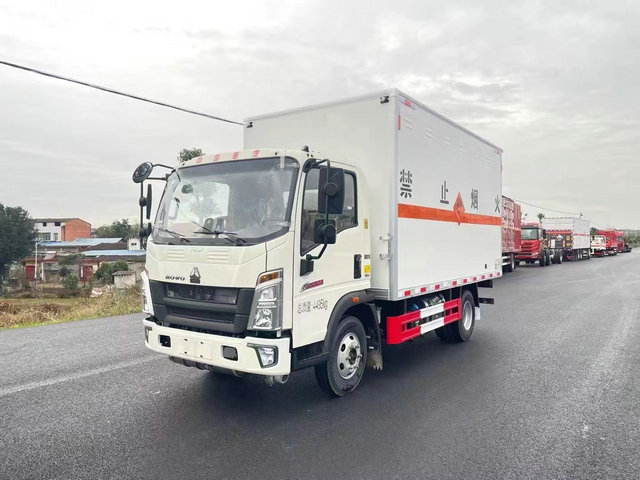 重汽豪沃爆破器材運輸車底盤配置:廂體長寬高:4200X2100X2400(MM),核載噸位:1050(KG),用冷軋鋼板,內部采用鋁板,夾層復合阻燃材料,嚴格控制防火阻燃性,車廂內以及邊部安裝的有煙霧報警器以及固定裝置,廂體貼‘爆破器材’危險品標識。